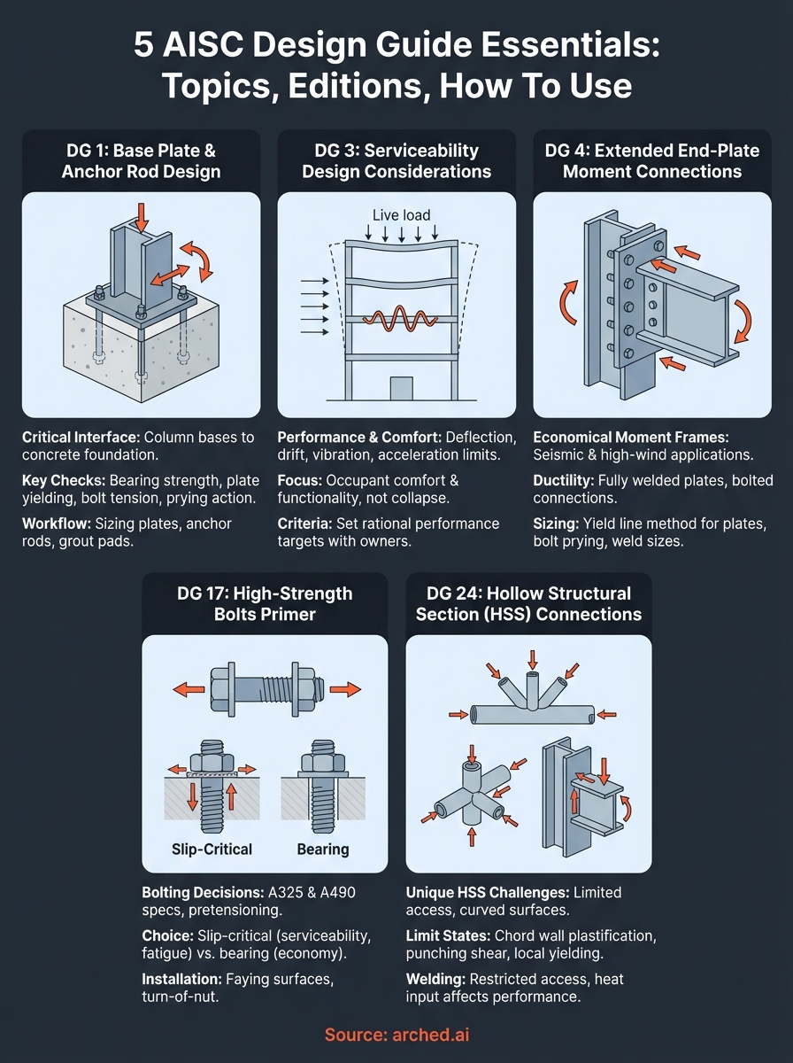 Explore 5 essential AISC design guide topics. Learn how to apply editions for base plates, bolting, and HSS connections while avoiding common design traps.