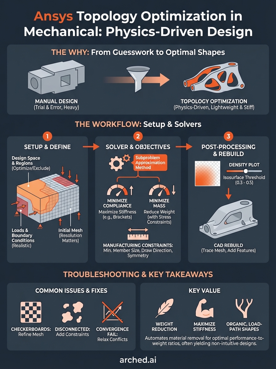 Ansys topology optimization transforms weight reduction from guesswork into a physics-driven process that mathematically identifies optimal material distribution. You define the design space, apply realistic loads and constraints, then let the solver explore thousands of configurations that manual design wouldn't consider. The workflow requires proper mesh resolution, manufacturing constraints, and accurate boundary conditions to produce manufacturable results.