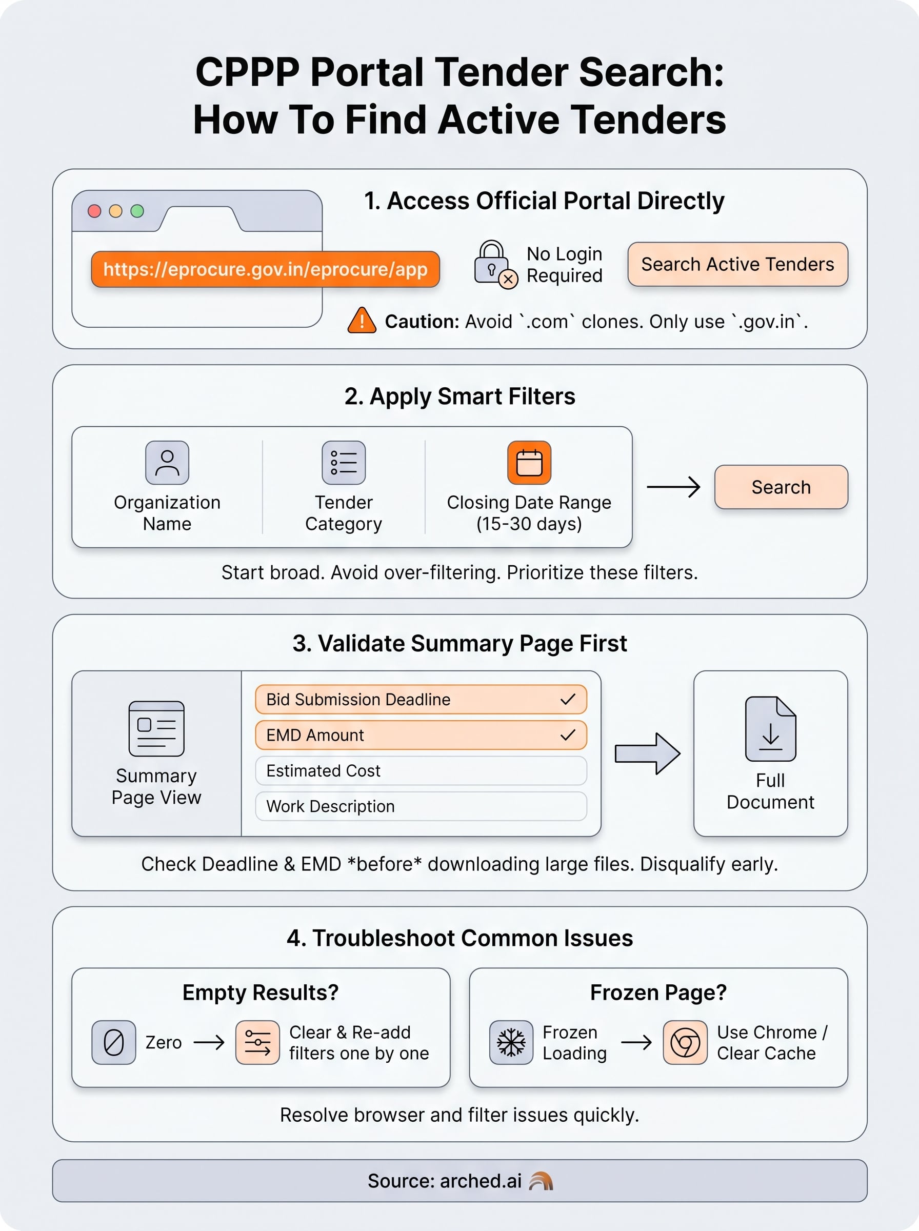 This guide walks you through how to actually find active tenders on CPPP, step by step, covering search filters, organization-wise browsing, and how to read tender details before downloading bulky documents. We'll also show you where the portal falls short and how tools like Arched can pick up the slack by monitoring CPPP alongside 500+ other procurement portals, matching tenders to your firm's specific credentials automatically.