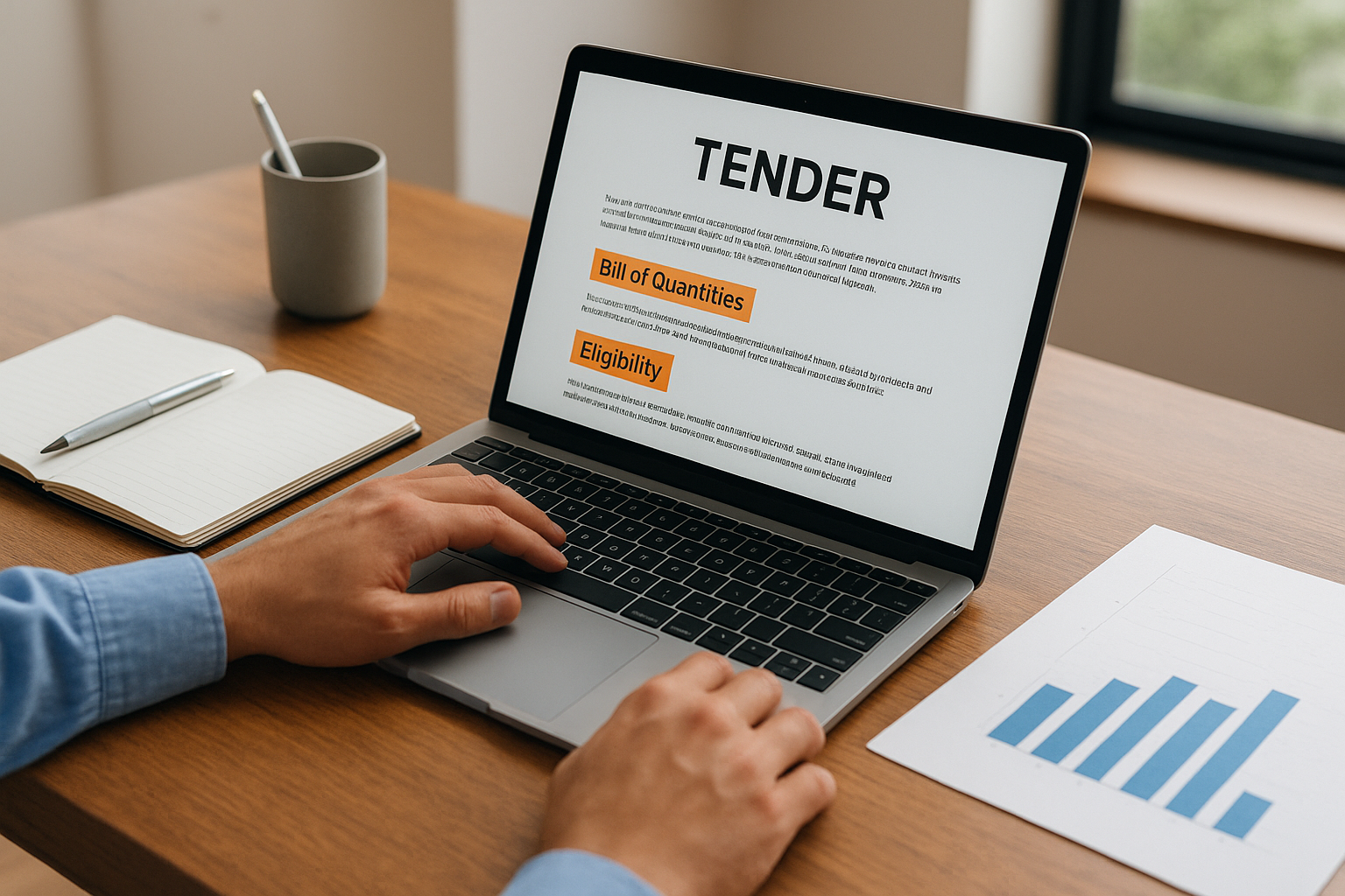 The platform automatically reads tender PDFs and extracts Bill of Quantities data, qualification criteria, and unusual contractual or legal clauses that carry financial risk. Instead of spending hours reviewing a 200-page notice yourself, you receive a structured summary with the critical details already surfaced and flagged for your review.