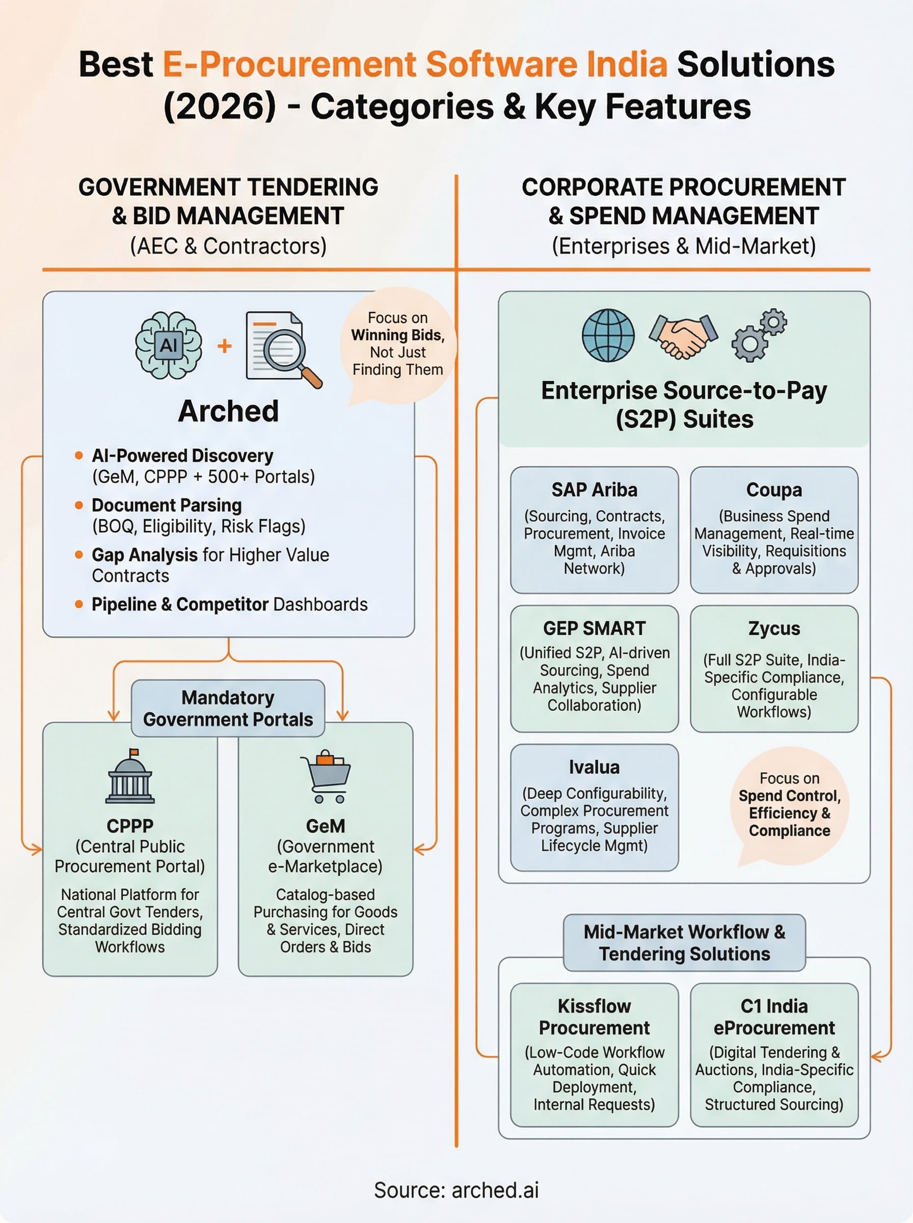 Picking the right e-procurement software India solution comes down to one question: what problem are you actually trying to solve? If your team needs to control internal corporate spend, platforms like Coupa, Zycus, or GEP SMART give you structured workflows and budget guardrails. If you need access to central government tenders, CPPP and GeM are mandatory starting points, not optional.