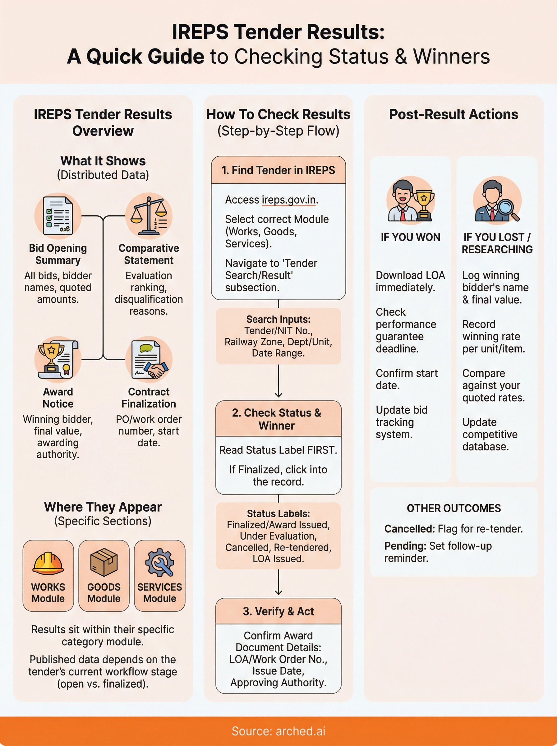The Indian Railways E-Procurement System (IREPS) does publish tender outcomes, including winning bidders, contract values, and award status, but finding that information efficiently is another story. The portal's interface isn't exactly intuitive, and results are scattered across different sections depending on the type of procurement (works, goods, or services).
