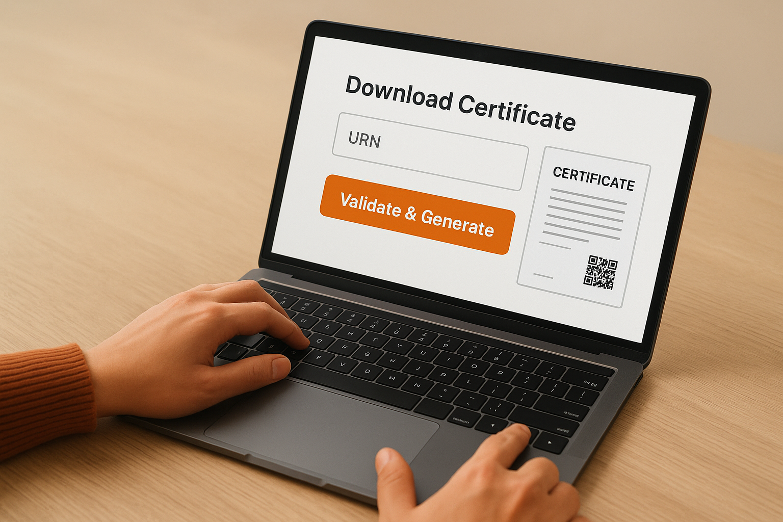 Enter your URN in the provided field and click "Validate & Generate OTP". Once you verify with the OTP, the portal displays your certificate as a PDF ready for download. Click the download icon or use your browser's save function to store it on your device immediately.
