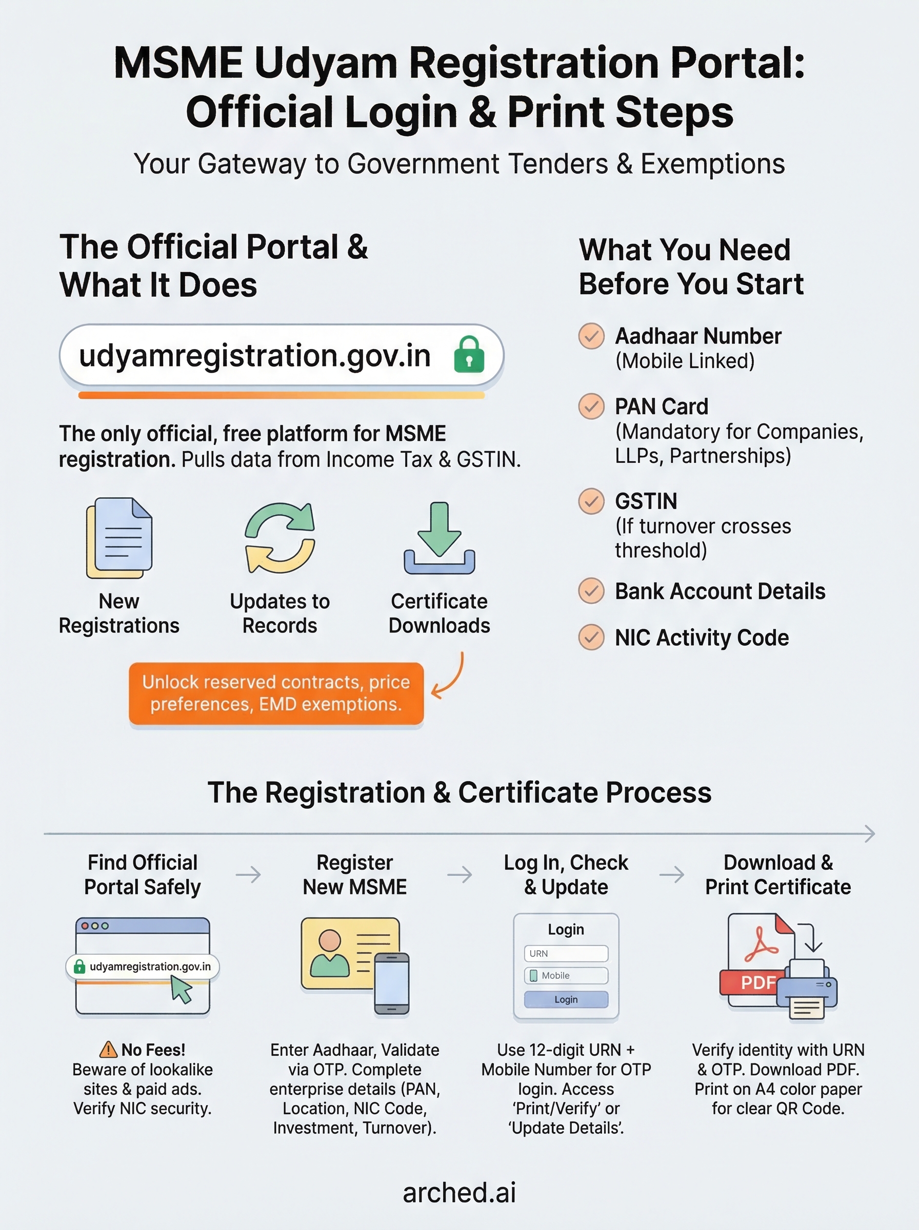 The process is straightforward, but small missteps, wrong Aadhaar details, missed fields, or logging into the wrong portal, can cost you days. For contractors and infrastructure firms chasing government projects, that delay means missed tender deadlines and lost revenue. At Arched, we help AEC firms track and qualify for high-value public contracts across 500+ portals, and we consistently see that a valid Udyam certificate is a baseline requirement for many of those opportunities.