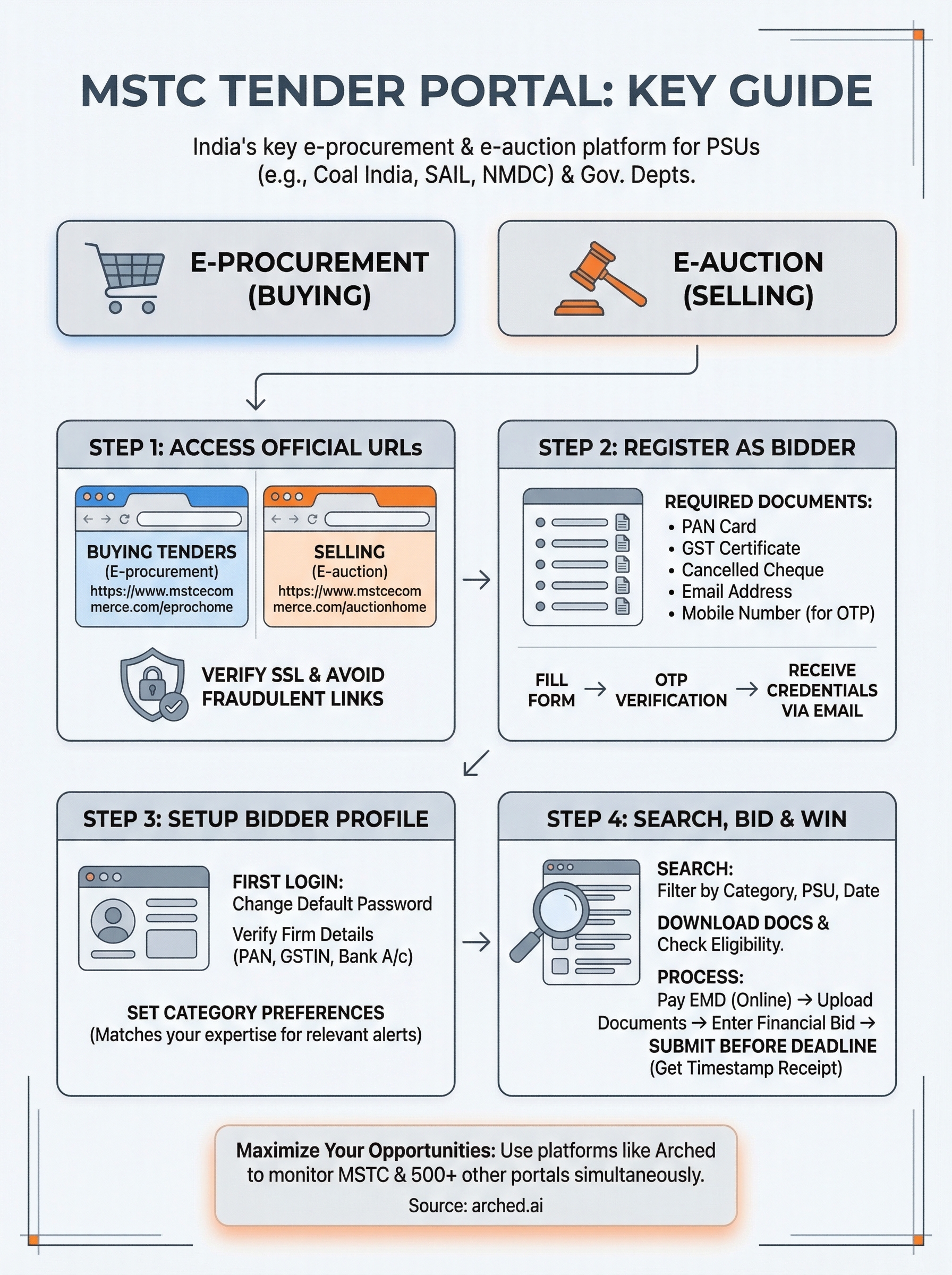 But here's the reality: MSTC is just one of over 500 procurement portals active across India. Tracking opportunities across all of them manually is a grind. That's exactly why we built Arched, an AI platform that monitors portals like MSTC, GeM, CPPP, and hundreds of state-level e-tender systems, then matches opportunities to your firm's specific credentials and experience.