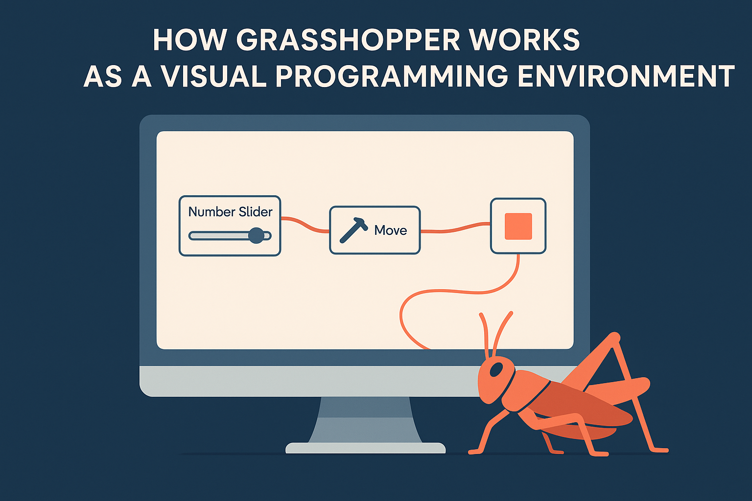 Grasshopper runs inside Rhino as a node-based visual programming editor. Instead of writing code line by line, you connect components with wires to build a data flow that generates geometry. Each component takes inputs, performs an operation, and passes outputs forward. A simple example: a "Number Slider" component feeds a value into a "Move" component, which shifts a surface by that distance. Adjusting the slider updates the geometry in real time inside Rhino's viewport.