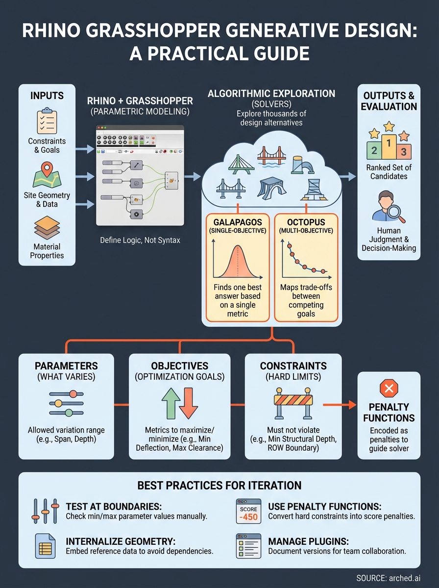 | Input type | What it defines | Bridge deck example | |---|---|---| | Parameters | What the algorithm is allowed to vary | Girder depth, span length, bearing spacing | | Objectives | What you are optimizing for | Minimize deflection, maximize clearance | | Constraints | Hard limits the design cannot violate | Minimum structural depth, ROW boundary |