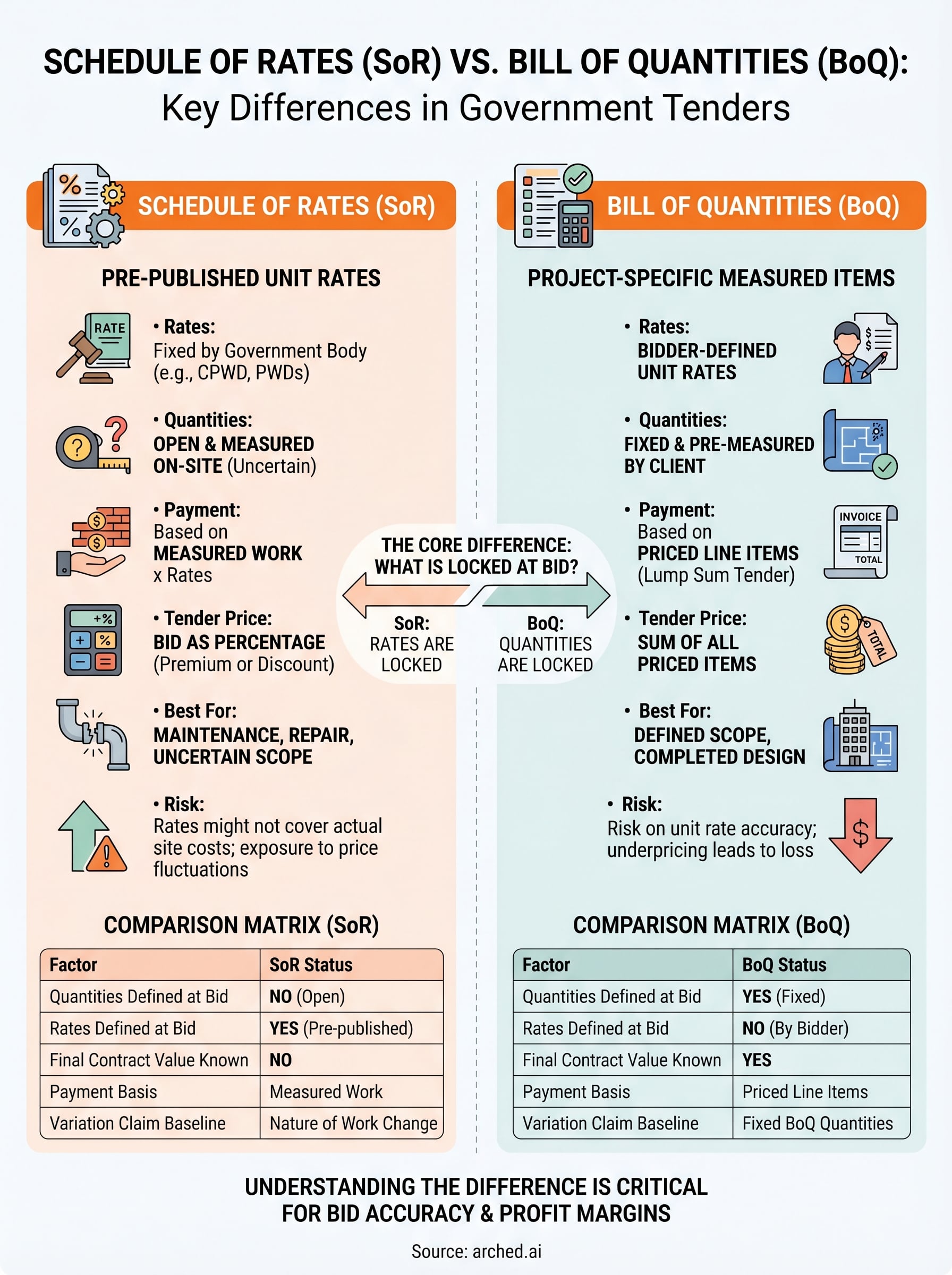 Understand the key differences in schedule of rates vs bill of quantities. Learn how each framework impacts pricing, risk, and bid strategy in Indian tenders.