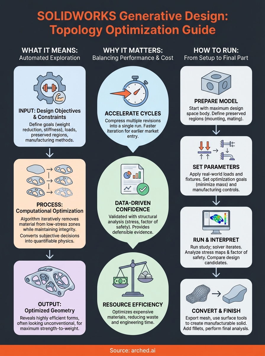 Master SOLIDWORKS generative design with this guide. Learn to run topology studies, reduce material costs, and turn optimized meshes into solid geometries.