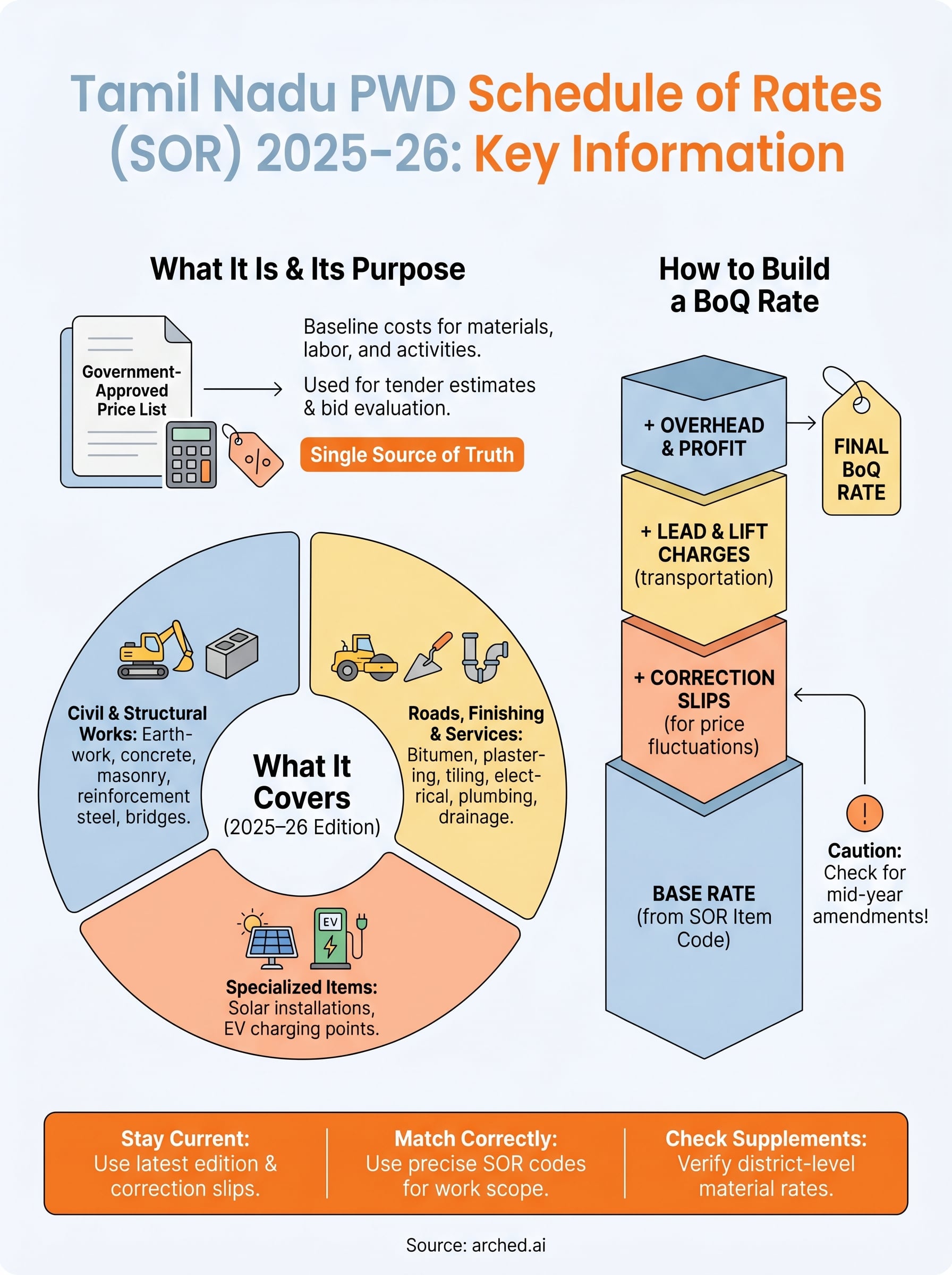 For the 2025-26 fiscal year, the core discipline is the same as always: match your scope to the correct SOR item, apply all amendments before you lock in any figure, and document your adjustments clearly. If you want to stop spending hours cross-referencing rates manually across portals and tender documents, explore what Arched can do for your bid pipeline. The platform parses tender BOQs and flags rate-relevant details automatically, so your team focuses on winning work, not chasing paperwork.