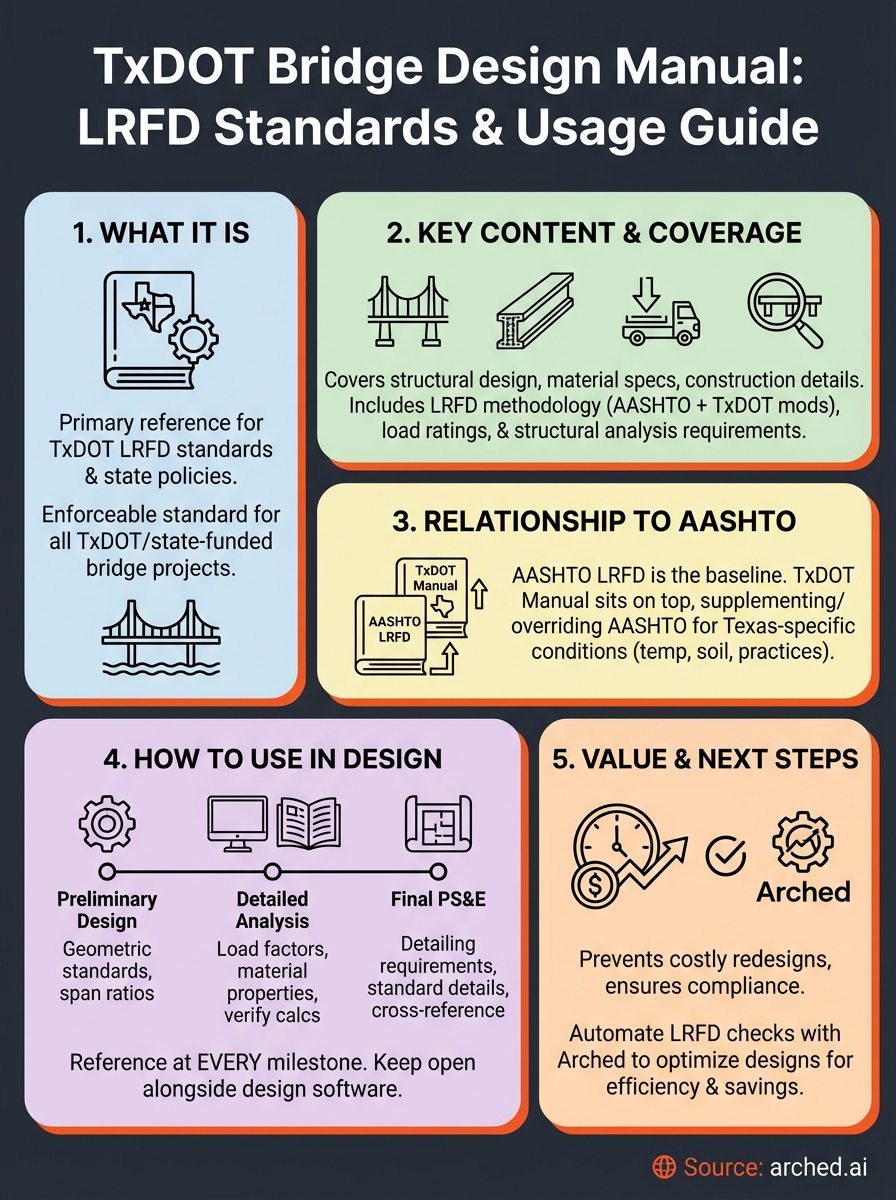 Understanding and applying these standards efficiently can make or break a project's timeline and budget. At Arched, we've built our generative engineering platform to automate compliance checks against standards like TxDOT's LRFD requirements, helping engineers evaluate thousands of design variations while staying within code. That process starts with knowing exactly what the manual requires.