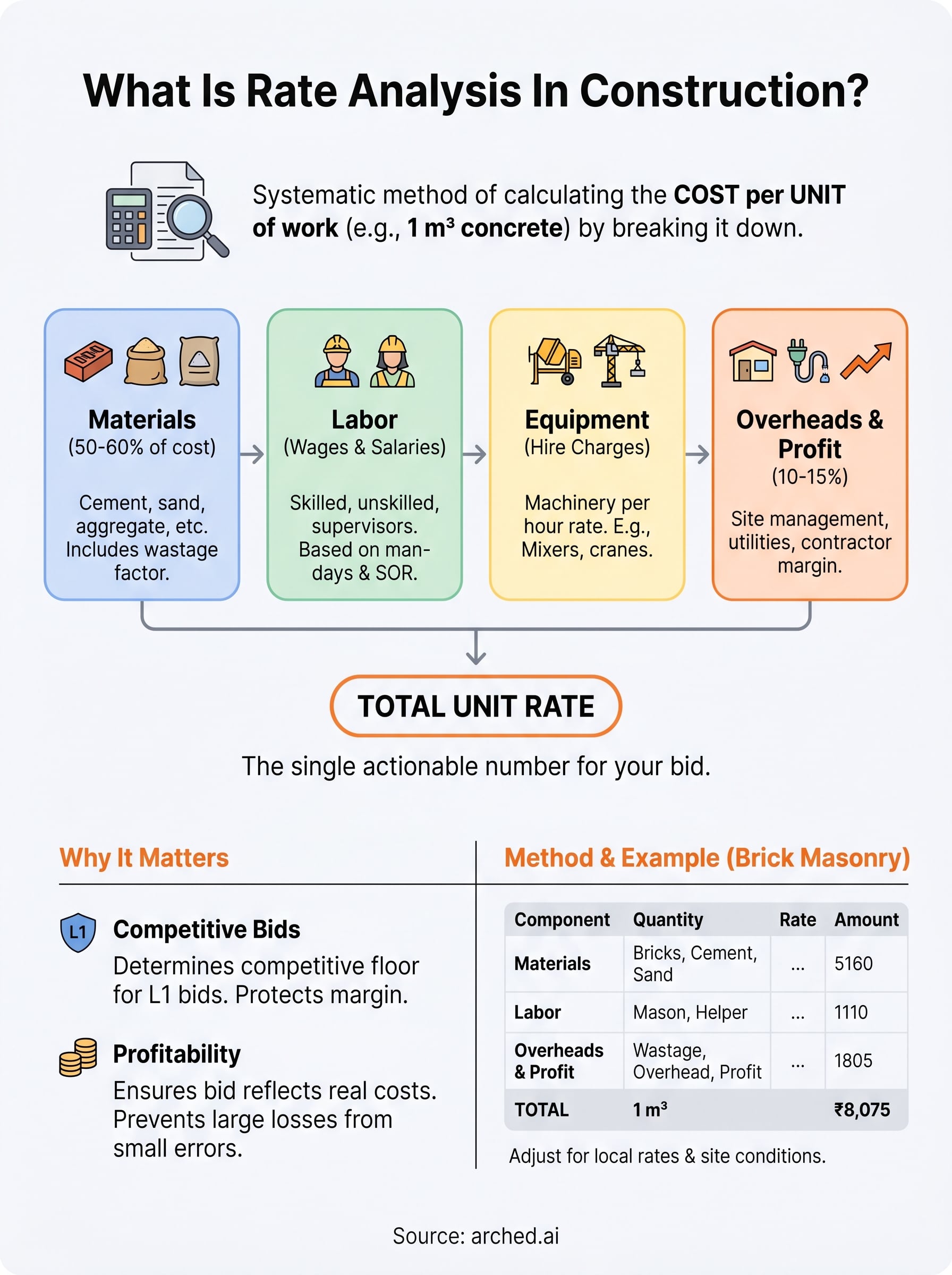 This article breaks down the complete method behind rate analysis: its core components, the step-by-step calculation process, and a worked example you can apply to your next bid. We also cover how platforms like Arched help contractors move faster, our AI parses tender documents and extracts BOQ line items automatically, so your team spends less time on data entry and more time on getting the numbers right.